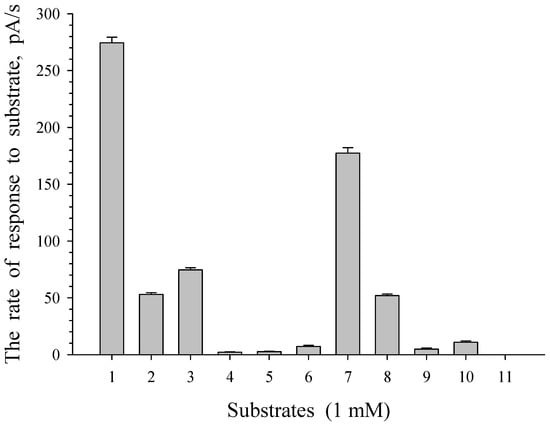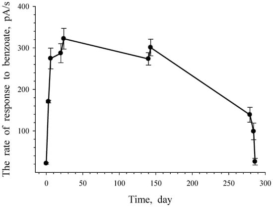 Subsequent storage for 4 months (151–280 days) resulted in the loss of half of the cell activity; however, the level of response to benzoate remained at a high level. The last two points of the experiment reflect the dynamics of the behavior of immobilized cells when they are stored on an electrode in distilled water. The pool of endogenous substrates that provide the cell’s energy consumption probably decreased, which was accompanied by a decrease in the cell response from 138.83 pA/s (279 days) to 25.79 pA/s (the last point—286 days).