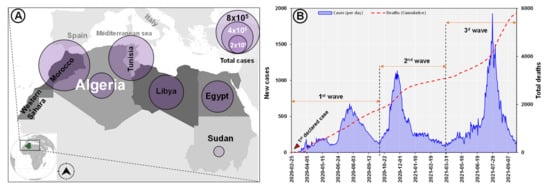 Total COVID-19 cases distribution in North African countries (A) and Algeria (daily new cases and cumulative deaths) (https://africacdc.org/covid-19/ accessed on 20 December 2021), (B) Graph based on a data source available online at (https://covid19.sante.gov.dz/carte/) (accessed on 20 December 2021).