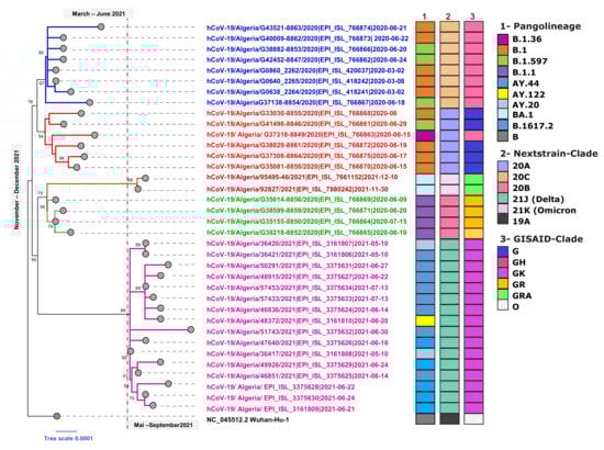 For the local Algerian virus comparison, thirty-six sequences were first aligned using a multiple sequence alignment algorithm (MAFFT v7. 471) []. The maximum likelihood tree was reconstructed with the IQ-TREE server using the general time-reversible (GTR) model with rate heterogeneity (GTR + G) and 1000 ultrafast bootstrap repetitions (http://www.iqtree.org accessed on 20 December 2021) []. The SARS-CoV-2 genomes were classified into lineages using the PANGOLIN web application (Phylogenetic Assignment of Named Global Outbreak LINeages) (https://pangolin.cog-uk.io accessed on 20 December 2021) []. The viral clades were assigned by the Nextclade tool (https://clades.nextstrain.org/ accessed on 20 December 2021) [] and through the UShER web interface from the University of California, Santa Cruz (https://genome.ucsc.edu/cgi-bin/hgPhyloPlace accessed on 20 December 2021). Viral clades were defined on the basis of available genomes sharing the same pattern of mutations. The Algerian population was comparatively evaluated against the Wuhan reference genome (NC_045512.2-Wuhan-Hu-1) obtained from NCBI GenBank. Quality checks of the sequences and evaluation of genetic distance were performed in MEGA software version 6 [] and the final dataset was displayed using Interactive Tree of Life (iTOL) v.4 (https://itol.embl.de/ accessed on 20 December 2021) [].