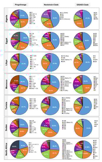 3.3. Distribution of SARS-CoV-2 Lineages and Clades in North Africa