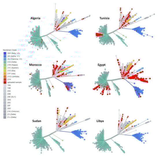 Unrooted phylogenetic relationship of analyzed SARS-CoV-2 sequences from North African countries to the global SARS-CoV-2 genomes. Clades distribution according to the Nextclade online tool (https://clades.nextstrain.org/) (accessed on 30 December 2021) and the phylogenetic tree was generated using the UShER Interface.