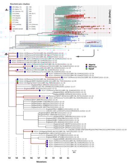 A total of 25 genome sequences were obtained from GISAID, collected between October and December 2021. Spatiotemporal phylogenetic analyses were conducted using the complete genomes available at the time, with two genomes from Algeria, one genome from Egypt and 22 genomes from Morocco. As is shown Figure 5A, the global phylogeny of SARS-CoV-2 sequences (Delta and Omicron) from North Africa (as of 20 December 2021) showed that Omicron sequences (21K) could have been a progeny of the nextclade 20B. The global subtrees (Figure 5B) showed evidence of different geographic origins of Omicron lineage. The majority of analyzed sequences were closely related with BA.1 sequences from England and the remained genomes were related to sequences from Scotland and United States suggesting multiple introductions of SARS-CoV-2 variants into North African countries. In addition, the phylogenetic analysis showed that the BA.1 genomes formed monophyletic clusters indicating local transmission of Omicron lineage in Morocco compared to the two Algerian sequences.