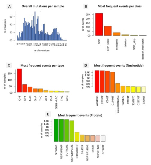 Distribution of numbers of mutational events of analyzed SARS-CoV-2 genomes in North African countries. (A) Distributions of number of mutations for each sample, (B) Distribution of SARS-CoV-2 mutation classes “SNP,” “deletion,” and “insertion”, (C) Listed nucleotide changes represent those found in the viral RNA, (D) distribution of SARS-CoV-2 most frequent specific events, annotated as nucleotide coordinates over the reference genome, (E) distribution of SARS-CoV-2 most frequent specific events, annotated protein changes using the format protein-mutation.