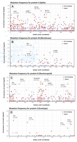 Occurrence of mutations in the SARS-CoV-2 structural proteins S (Spike) (A), M (Membrane) (B), N (Nucleocapsid protein (C), and E (Envelope (D). The frequency (in percentage) of the top amino acid-changing mutations is indicated.