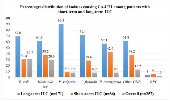 The overall prevalence of laboratory-confirmed CA-UTI among patients with IUC was 56.8% (250/440). Patients with long-term IUC had a significantly higher prevalence of CA-UTI than patients with short-term IUC (82.2% (166/202) vs. 35.3% (84/238) p < 0.001), (Figure 1). Seven patients had dual bacterial growth, resulting in a total of 257 isolates. Gram-negative rods (GNRs) were predominantly isolated (98.1%, 252/257), whereas E. coli (30.7%, 79/257) and Klebsiella spp. (29.6%, 76/257) were the leading causes of CA-UTI among patients with IUC. Only 1.9% (5/257) of isolates causing CA-UTI among patients with IUC at this setting were Gram-positive cocci (GPC) (Figure 2).