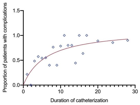 Increasing duration (days) of catheterization increases the risks of complications.
