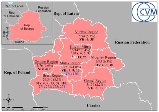 In fact, ST4 was predominant (27/63, 42.9%), while two other STs, ST9 and ST13, were found regularly (11/63, 17.5% and 10/63, 15.9%, respectively). In contrast, the rest of STs could be rarely detected and were distributed as follow: ST6 (4/63, 6.4%), ST38 (3/63, 4.8%), ST271 (2/63, 3.2%). ST95 (1/63, 1.6%), ST110 (1/63, 1.6%), ST272 (1/63, 1.6%), ST273 (1/63, 1.6%), ST274 (1/63, 1.6%), and ST275 (1/63, 1.6%). The novel STs were registered in only two regions, namely Minsk (ST271 and ST275) and Brest (ST271, ST272, ST273, and ST274) (Figure 1).