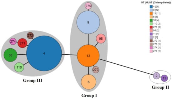 GrapeTree clustering of 14 STs available in the Chlamydiales PubMLST database (https://pubmlst.org/chlamydiales/ (accessed on 21 January 2022)). Each node corresponds to a single ST marked with an individual color. The numbers in square brackets indicate C. trachomatis representatives in the MLST database. MLST STs of the Group I and the Group III of C. trachomatis strains found in our study were marked with gray ovals. The representative STs, ST2 and ST11 of the Group II which are not found in this study were placed in a white oval. The novel STs, ST273 and ST275, belonged to the Group I with ST13 as the founder, and ST271, ST272 and ST274 belonged to the Group III with ST4 as the founder.