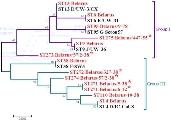 The first complex consisted of ST6/ST9/ST13/ST95/ST273 and ST275 (ST13 as a founder) and the second one included ST4/ST38/ST110/ST271/ST272 and ST274 (ST4 as a founder). However, in contrast with a neighboring country [,], we identified no CT strains belonging to Group II which were found to be associated with LGV strains []. Phylogenetic analysis also demonstrated the clustering of the majority of Belarus CT strains with other international CT isolates (Figure 3).