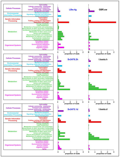 The largest number of identified proteins in B. bacillifera sponge viromes belonged to the “Metabolism” and “Genetic Information Processing” main categories (Figure 3). In the first category, the largest number of reads in both sponges (healthy and diseased) belonged to proteins involved in the metabolism of nucleotides, cofactors and vitamins. Additionally, the proteins of amino acid metabolism predominated in the diseased sponge. The proteins of the ‘Replication and repair’ prevailed in the Baikal water sample (LBw.4g), but the ‘Folding, sorting and degradation’ and ‘Translation’ (of the main category “Genetic Information Processing”), as well as the ‘Cell growth and death’ (“Cellular Processes”), were the most abundant in sponges. In general, the functional profile in the two sponge samples was similar, apart from the proteins of the secondary category ‘Amino acid metabolism’ (much more in diseased sponges) and the ‘Cell growth and death’ (also more represented in the diseased sponge). The proportions of reads in some other functional groups also differed but insignificantly.