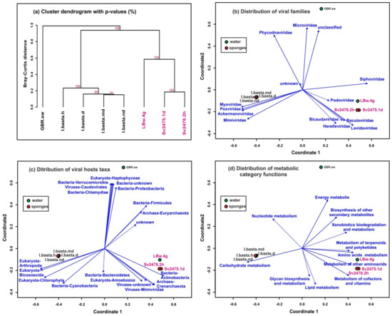 Clustering using UPGMA (unweighted pair group method with arithmetic mean, Figure 5a) and NMDS (non-metric multidimensional scaling; Figure 5b–d) based on the similarities and differences of assembled virome reads (scaffolds) identified three groups of samples. All samples from Lake Baikal were included in the first group, the second consisted of the samples of marine sponges, and the third group was a virome of ocean water from the sampling site of the I. basta sponges. Thus, the distances between marine samples (sponges and surrounding water) turned out to be much greater than between the Baikal samples (Figure 5a). The distribution of biplots also showed significant distances between samples of freshwater and marine sponges. The differences in viromes were clearly traced in mainly different directions of vectors of large taxonomic groups of viruses (families of virotypes) (Figure 5b), their predicted hosts (Figure 5c), and metabolic functions of viral communities in the samples (Figure 5d).