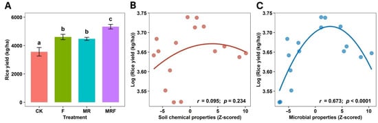 More interestingly, although the MR treatment achieved the highest soil chemical and microbial indices (Supplementary Table S1), the highest rice yield was obtained under the MRF treatment. This outcome suggests that there was a nonlinear relationship between the rice yield and soil properties, which would be consistent with the quadratic correlations between soil properties (especially for soil microbial properties) and the rice yield (Figure 1B,C). This observation is consistent with previous work related to the impact of soil properties on the crop yield [42,43]; these studies highlighted that it is the optimal, rather than maximum, soil chemical and microbial values that benefit crop productivity. There could be various factors explaining this phenomenon, for example, higher and/or lower-than-optimum soil pH is usually considered a major obstacle to crop productivity [42]. In addition, the combined effect of soil properties (e.g.,; pH and/or nitrogen) on plant growth may be superimposed. For example, it was found that high soil pH and nitrogen could superimpose on each other and together have a negative effect on the rice yield [42]. Another potential explanation may be that there could have been an optimal enzyme concentration that accelerated the hydrolysis and fermentation of the available organic carbon form for plant growth. An increase in enzyme concentration can indeed accelerate plant growth due to a surplus in carbon availability; however, a continuous increase in enzyme concentration may result in no marked effect on plant production [44]. In this study, the soil chemical and microbial properties may have become optimal for rice plant growth under MRF. Collectively, the abovementioned factors provide plausible reasons for why MRF, with its moderate soil chemical and microbial indices, achieved the maximum rice yield.