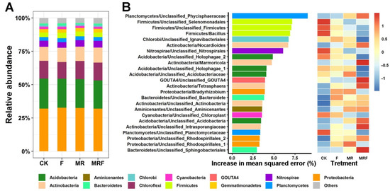 Phylum-level compositions of the bacterial community under different fertilization treatments (A). Predictor importance (percentages of increase in mean square error) of the top 24 bacterial taxonomic biomarkers and their relative levels of abundance (standardized by Z-score transformation) under each fertilization treatment (B). CK: without fertilization, F: mineral NPK fertilizers, MR: mushroom residues, MRF: mineral NPK fertilizers plus mushroom residues.