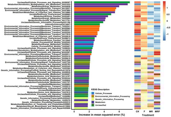 Predictor importance (percentages of increase in mean square error) of the top-54 bacterial metabolism functions under each fertilization treatment. CK: without fertilization, F: mineral NPK fertilizers, MR: mushroom residues, MRF: mineral NPK fertilizers plus mushroom residues.