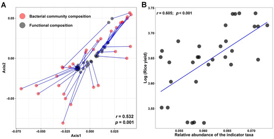 As mentioned earlier, the RF model was used to further reveal the bacterial indicator functions under different fertilizations. Interestingly, it was found that 13 bacterial indicators of KEGG Orthology functional genes, such as K01032 and K10676, responsible for xenobiotic biodegradation were enriched in the MRF treatment (Figure 4). The strong Procrustes correlation (r = 0.532, p = 0.001, Figure 5A) between the bacterial indicator community composition and the indicator organisms’ metabolism functions in MRF suggests that the enriched KEGG Orthology functions may be mainly derived from the enriched bacterial indicator taxa. This suggestion is consistent with the functional analysis of the bacterial phylum of Actinobacteria, which accounted for 50% of the total indicator species in MRF (Figure 2B). For example, the relative levels of abundance of actinobacterial functional genes, responsible for xenobiotic biodegradation and metabolism including carbohydrate metabolism, were significantly higher in MRF than in CK, NPK, and MR treatments (p < 0.05). Mushroom residues contain poly-aromatic hydrocarbons (a kind of organic matter derived from mushroom residues) and are considered xenobiotic compounds [51], or in other words, a substrate that can specifically select for Actinobacteria to degrade and convert to nutrients for the rice plant to uptake. This observation is in line with previous studies indicating that Actinobacteria play a key ecophysiological role in plant residue decomposition [52,53].