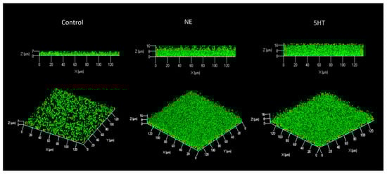 Our group already assessed the biofilm formation ability of E. faecium NCIMB10415 with the crystal violet method in control and stimulated conditions, and both molecules caused a significant enhancement of biomasses after the treatment [22,23]. The CLSM technique was chosen to validate the results obtained with the CV staining since this method is not considered precise. Biofilms were grown for 24 h (results not shown as no significant differences were observed) and 48 h (medium and molecule replacement) on glass surfaces, then their biovolumes, average and maximum thickness were analyzed. Figure 1 and Table 1 illustrate and summarize how NE and 5HT affected our strain’s capability to form biofilms. The hormones have augmented all the three parameters; in detail, the treatment with 100 µM NE enhances the three of them by about 50%, while 50 µM 5HT increases twofold the biovolume and the maximum thickness with respect to the control, while the average thickness is augmented by about 40%. These results strongly confirm the CV assay outcomes concerning the boosting effect of the molecules and its measurement; indeed, 5HT shows a more intense effect compared to NE, precisely as demonstrated with the CV test [22,23].