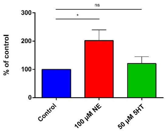 E. faecium NCIMB10415 adhesion on Caco-2/TC7 cells in control condition (blue) or stimulated with 100 μM NE (red) or 50 μM 5HT (green). Treatment with 100 μM NE increases the bacterial adhesion. The results are represented as % of control ± SEM. * p < 0.05; ns: not significant.