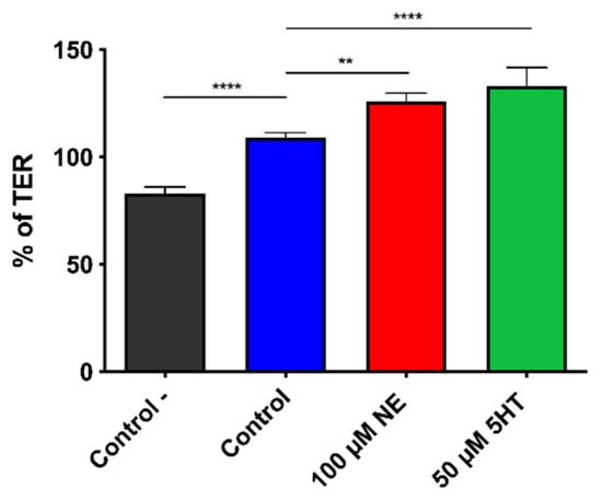 Modulation of Caco-2/TC7 TER after 20 h exposure to E. faecium NCIMB10415 in control conditions (blue) or treated with 100 μM NE (red) or 50 μM 5HT (green). Both treatments of the bacteria improve the TER compared to the control condition. In the bar chart is presented also the % of initial TER for the untreated Caco-2/TC7 cells as ‘Control–’ (black). Results are expressed as % of initial TER ± SEM. **** p ≤ 0.0001, ** p < 0.01.