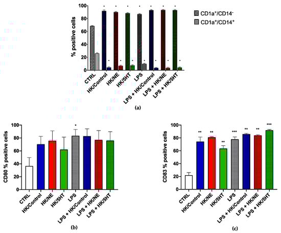 We analyzed the expression of DC differentiation and maturation markers after challenging DC with HK/Control, HK/NE or HK/5HT, alone and in the presence of the costimulatory molecules (LPS). The differentiation of DC was assessed by flow cytometry using the DC marker CD1a and the monocyte marker CD14, whereas the markers CD80 and CD83 were evaluated to ascertain DC maturation. The overall results are summarized in Figure 4. As expected, in the control DC, we found a high percentage of CD1a+/CD14−, (about 70%), a low percentage of CD1a+/CD14+ (25%), and the absence of CD1a−/CD14+ (less than 2%). In the presence of all the tested stimuli, we observed a significant increase in the percentage of CD1a+/CD14−, in parallel with a decrease in CD1a+/CD14+, compared to control conditions (Figure 4a). We next analyzed both CD80 and CD83 expression in terms of the percentage of positive cells as markers of maturation of DC. As shown in Figure 4b, a similar increase in the percentage of CD80-positive cells over control DC was observed in both HK/Control, HK/NE, and HK/5HT-treated DCs. CD80 expression was increased to the same extent following LPS stimulation and was not affected by costimulation with bacteria. Similar results were obtained for the percentage of CD83-positive cells (Figure 4c).