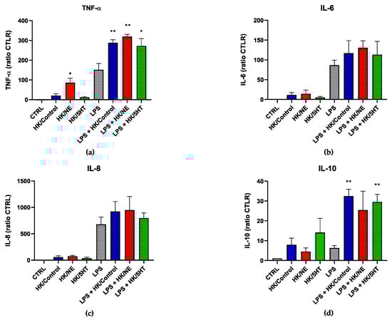 Cytokines’ quantification in DCs culture supernatant after 40 h incubation with HK/Control (blue), HK/NE (red) and HK/5HT (green). Untreated DC supernatants represent the negative control (CTRL). Results are expressed as ratio of CTRL ± SEM. (a) TNF-a; (b) IL-6; (c) IL-8; (d) IL-10. • p ≤ 0.05 to HK/Control; ** p < 0.01, * p ≤ 0.05 to LPS.