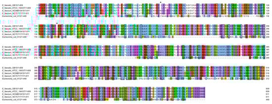 Multiple sequence alignment confirmed that VicK (WalK) from E. faecium NCIMB10415 was conserved compared to similar sequences from E. faecalis strains (Figure 6). Interestingly, two indels were observed at positions -70N and -140D by comparison to the E. faecalis sequences.