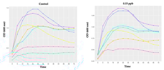 The bacterial growth curves represent the optical density (OD) units at 600 nm over time (hours) for Hafnia sp. and Enterobacter sp. cultured in TSB liquid media supplemented with 0 ppb (green curve) (unexposed group); 0.15 ppb (red curve); 1 ppb (blue curve) and 10 ppb (violet curve) for 72 h. Experiment was performed in triplicate. Each data point represents the average optical density (600 nm) measured every 6 h. Multiple comparisons using an ANOVA analysis were computed. p-values were adjusted with Tukey’s method.