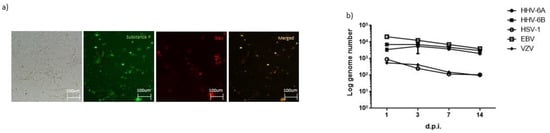 (a) Microglial cell obtained from peripheral blood monocytes, stained for substance P and Iba1. (b) Viral load in control microglia cells infected with HHVs.