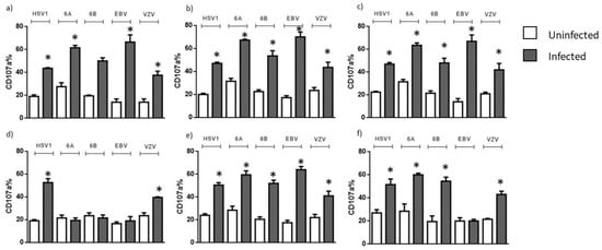 Positive and negative KIR2DL2 natural killer (NK) cells from MS and OIND patients were co-cultured with HSV-1, HHV-6A, HHV-6B, VZV and EBV microglial-infected cells. The activation of NK cells was evaluated as a percentage of NK cells expressing the CD107a degranulation marker. We showed an increase in activated KIR2DL2-negative NK cells from all the three populations in the presence of HSV-1, HHV-6A, HHV-6B, VZV and EBV-infected cells (Figure 2a–c) (p < 0.001; t-Student’s test). KIR2DL2-positive NK cells from the control population in the presence of HSV-1, HHV-6A, HHV-6B, VZV and EBV-infected cells showed an increase in CD107a expression (Figure 2d). In contrast, KIR2DL2-positive NK cells from MS patients were not activated in the presence of cells infected with HHV-6A, HHV-6B and EBV (Figure 2e). KIR2DL2-positive NK cells from OIND patients were not activated in the presence of cells infected with EBV (Figure 2f).