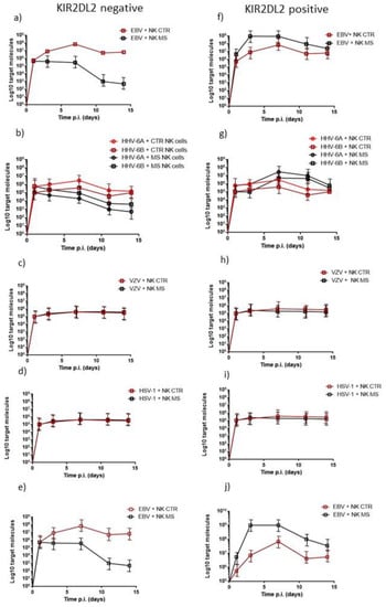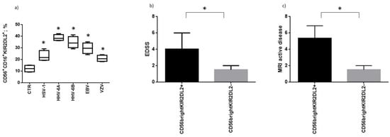- Rizzo, R.; Gentili, V.; Casetta, I.; Caselli, E.; De Gennaro, R.; Granieri, E.; Cassai, E.; Di Luca, D.; Rotola, A. Altered natural killer cells’ response to herpes virus infection in multiple sclerosis involves KIR2DL2 expression. J. Neuroimmunol. 2012, 251, 55–64. [Google Scholar] [CrossRef]