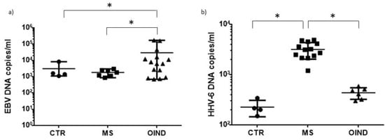Viral load of (a) EBV and (b) HHV-6 in control, MS and OIND populations. * significant p value, Student’s t test. The data are presented as mean ± SE.