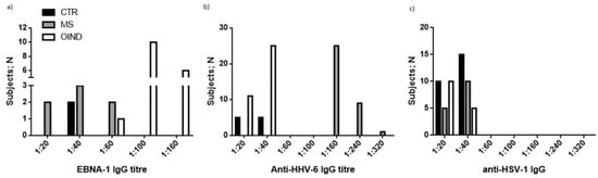 Anti-HHV antibodies were evaluated in plasma samples from MS and control subjects with diagnostic ELISA kits (EBV, HHV-6, VZV; HSV-1; HSV-2) (Bethyl Laboratories, Montgomery, TX, USA). The endpoint Ig titers were evaluated with serial dilutions (1:10, 1:40; 1:60; 1:110; 1:240; 1:360) of the samples.