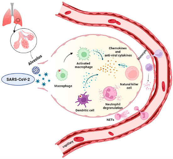 Chemokines produced during COVID-19-ARDS recruit neutrophils in the site of infection, supported by transcriptional analysis of bronchoalveolar lavage fluid from patients with high levels of CXCL-2 and CXCL-8 [100,101]. Once recruited in the site of infection, neutrophils release different proinflammatory mediators, including cytokines (interferon-α, interferon-β, tumor necrosis factor, and interleukins 1β, 6, and 10) and chemokine (e.g., CXCL10) that participate in COVID-19 pathogenesis [102].
