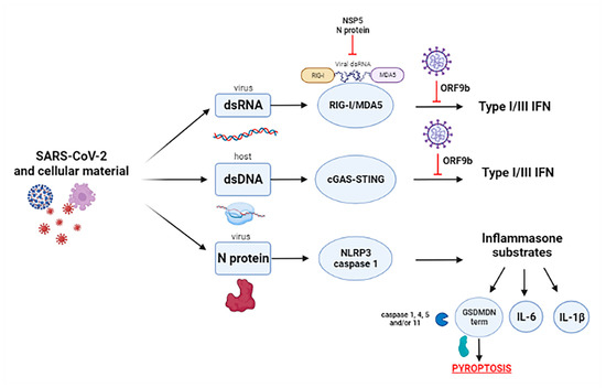 Virus- and host-derived molecules are sensed by several PRRs (Pathogen Recognition Receptors) to induce antiviral and inflammatory responses. SARS-CoV-2 ORF9b and NPS5/N proteins inhibit the activation of type I/III IFNs induced by retinoic acid-inducible gene I (RIG-I)/melanoma differentiation associated protein (MDA5)—mitochondrial antiviral-signaling protein (MAVS) and Cyclic GMP-AMP synthase (cGAS)—Stimulator of Interferon Genes (STING) signaling. SARS-CoV-2 N protein is also able to activate pyrin domain-containing 3 (NLRP3) inflammasome, whose main activation marker is caspase 1, that can lead to the production of IL1B and IL-6 and to pyroptosis, through gastermin D (GSDMD) Nterm cleavage by caspase 1, 4, 5, and/or 11.