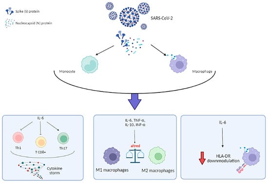 Moreover, the expression of viral receptor ACE-2, furin and TMPRSS2 (transmembrane protease serine 2), has been demonstrated in an alveolar mice model [79], suggesting that these cells can be targeted by SARS-CoV-2. Again, monocytes and macrophages culturing in the presence of SARS-CoV-2 S and N proteins resulted in high levels of IL-6 [80] (Figure 5).