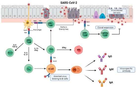 During SARS-CoV-2 infection, peptides synthetized during viral replication are loaded on HLA class I proteins and presented on the surface of infected cells. The viral peptide-HLA-I complexes recognition by CD8+ cytotoxic T cells induces their activation and expansion [132], leading to the development of virus-specific effector and memory T cells. Moreover, also CD4+ helper T cell, mostly T helper 1 lymphocytes (Th1) and T helper 17 lymphocytes (Th17) [133] recognize SARS-CoV-2 antigens bound by HLA class II (MHLA-II) on professional Antigen presenting cells (APCs) and in turn Follicular helper (FH) T contribute to B cell activation into plasma cells (PC), that release specific anti-SARS-CoV-2 antibodies. At first, IgM are released during the acute phase of infection [134], followed by IgG or secretory IgA, that will also persist as part of immunological memory [135] (Figure 7).