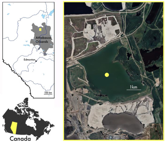 Location of Athabasca Oilsands region (grey) in Alberta, Canada. Aerial photo of Base Mine Lake (right panel) depicting sampling station (yellow dot).