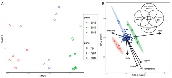 (A) Non-metric multidimensional scaling (NMDS) plot of samples at sequence variants level (based on Bray–Curtis dissimilarity from Illumina sequencing of 16S rRNA gene amplicons), depicting differences between microbial community structure among years (August 2016–2018) and stratifications zones at Base Mine Lake (stress = 0.11, ANOSIM; R = 0.8–0.9, p < 0.001). (B) RDA ordination depicting microbial diversity (based on sequence variants) in relation to significant aqueous physico-chemistry and geochemistry. The Venn diagram shows the significant effect (%) of physico-chemistry (temperature), e- acceptor (oxygen, nitrite and nitrate), e- donor (methane) and alum (AlSO42−) treatment on the bacterial diversity at BML (p < 0.001). *** p < 0.001, * p < 0.03.