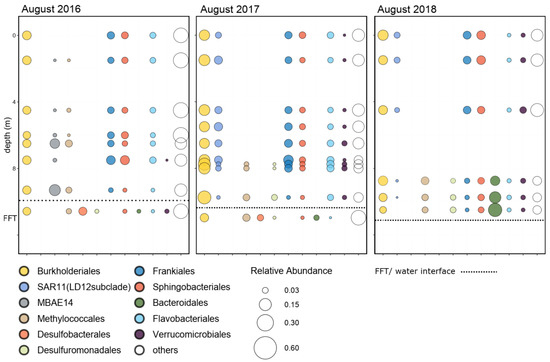 Relative abundance of bacterial dominant orders, detected by Illumina sequencing of 16S rRNA gene amplicons, for the Base Mine Lake water cap (summer 2016–2018) and FFT water interface (2016, 2017).