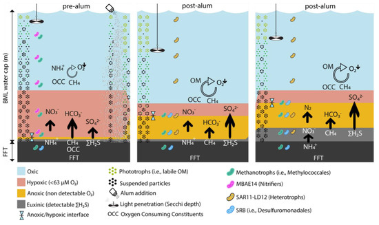 The increased oxygen consumption associated with aerobic degradation of this new biomass source induced anoxia and enabled anaerobic biogeochemical cycling directly within the BML water cap post alum. Rapid interlinked structural and functional changes in the microbial community, important to biogeochemical cycling and overall oxygen status of BML, occurred in response (Figure 5). Specifically, microbial groups associated with labile organic carbon processing appeared (i.e., SAR11-LD12 subclade); specialist groups such as MBAE14, associated with carbon-limited, ammonia-rich restricted niches that existed in BML prior to alum addition [14], disappeared; and the SRB group Desulfuromonodales appeared (Figure 4 and Figure 5).