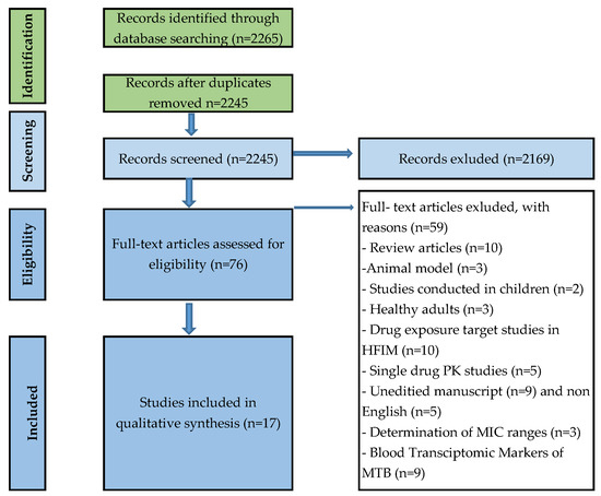 The literature search yielded 2665 reports; 2589 were excluded during the initial title and abstract screening as not relevant. After a full article review of 76 studies, 17 studies were eligible for inclusion as summarised in the Preferred Reporting Items for Systematic Reviews and Meta-Analyses (PRISMA) flowchart provided in Figure 1. Three studies (17.6%) reported transcriptomics signatures with the use of high throughput methods, and 14 studies (82%) concerned in vitro models for the confirmation of synergistic or antagonistic drug interaction in clinical and laboratory samples. The small number of transcriptomic studies might be because the methods used have become more accessible in recent years, and the understanding of pharmacokinetics and the mechanism of action of new anti-TB drugs is still developing. Although studies did address transcriptomic signatures during treatment, no prospective clinical trial was found that was designed to address the use of transcriptomic signatures to predict the drivers of drug synergy and clinical regimen efficacy in M. tuberculosis.