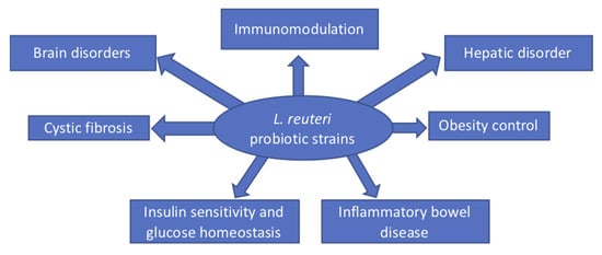 When L. reuteri is ingested, the protective effects are reported to be due to different metabolic mechanisms. First, certain strains of L. reuteri produce an anti-inflammatory compound that lowers the expression of the proinflammatory cytokine tumor necrosis factor alpha (TNF-α) in cultured activated macrophages by more than 90% [,]. Second, L. reuteri produces reuterin, an antibacterial molecule that is bactericidal against a wide range of species, including enterohemorrhagic Escherichia coli strains []. Reuterin, also known as 3-hydroxypropionaldehyde [3-HPA], is an intermediate in the metabolism of glycerol to 1,3-propanediol, guaranteeing that the cell replenishes NAD+ during glucose metabolism []. This review provides an overview of data that support the role of probiotic properties, and the antimicrobial and immunomodulatory effects of L. reuteri strains in relation to their metabolism on the amelioration of many diseases and disorders (Figure 1).