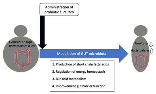 The regulation of energy homeostasis and satiety, alteration of gut microbiota composition, synthesis of short chain fatty acids (SCFA), improved gut barrier function, and the interruption of bile acid metabolism in the host are all the proposed mechanisms of action for probiotic-mediated weight loss []. As a matter of fact, L. reuteri is one of the probiotic bacteria that can perform these mechanisms to control obesity (Figure 2). On the other hand, food ingredients that enhance the growth of L. reuteri in the gut result in weight loss []. Further research is needed to determine whether an increase in L. reuteri is the cause of weight reduction per se or whether it is substrate-dependent.