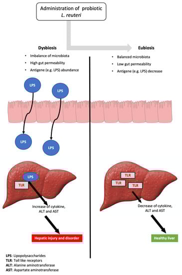 Finally, Cui et al. [] indicated that L. reuteri ZJ617s diminished gut permeability and suppressed the secretion of hepatic pro-inflammatory cytokines by inhibiting the TLR4/MAPK/NF-B and autophagy signaling pathways, which decreased plasma concentrations of AST and ALT, and alleviated hepatic histological changes.