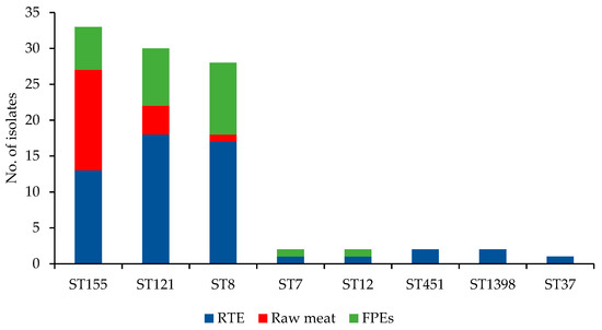 Further analysis of WGS sequences revealed that all 100 current isolates were classified into eight sequence types, with the most prevalent ST155 (33; 33.0%), ST121 (30; 30.0%), and ST8 (28; 28.0%) (Figure 2). The remaining nine strains belonged to five distinct STs (ST7, ST12, ST37, ST451, and ST1398) and were mainly isolated from RTE food. The number of STs in relation to different sources of the strains tested is shown in Table 1. Three STs (ST8, ST121, and ST155) were identified in L. monocytogenes isolated from all three sources analyzed (Table 1). The results of other authors also showed that ST155 and ST121 were often identified among L. monocytogenes of food origin [14,15,21]. It seems that such isolates may have a molecular background that allows them to survive in food and food production environments in different areas for a long time [11,15].