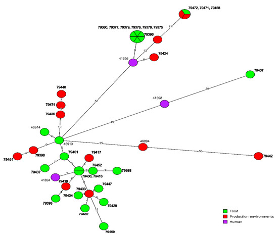 Minimum spanning tree (MST) based on the cgMLST profiles of L. monocytogenes CC8 tested in the present study with publicly available twelve strains of CC8 from Poland. Source of the isolates are represented by colored circles where the size is proportional to the number of strains. Numbers on the branches show alleles differences between neighboring nodes (CTs). The strain numbers in bold represent L. monocytogenes isolates from the present study.