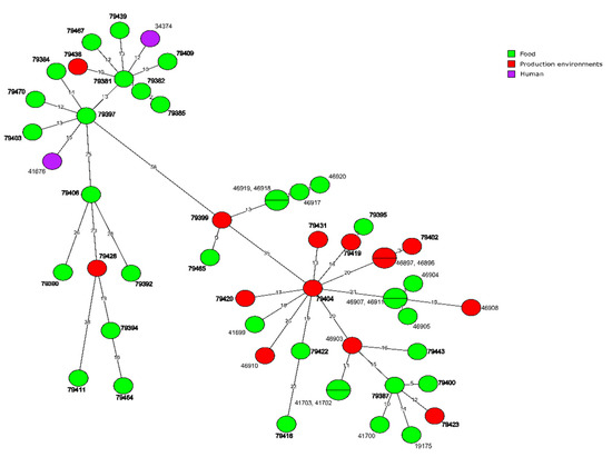 The present isolates were further grouped into 60 different cgMLST types (CTs), with the most numerous CT1170 (17 isolates) and CT750 (12 strains), both mainly recovered from RTE food and food production environments (a total of 12 and 11 isolates, respectively), but also from raw meat (five isolates of CT1170) (Figure 3). There were also CTs unique to the source of isolation (Table S1). The number of CTs identified in the strains of different origins tested is shown in Table 1.