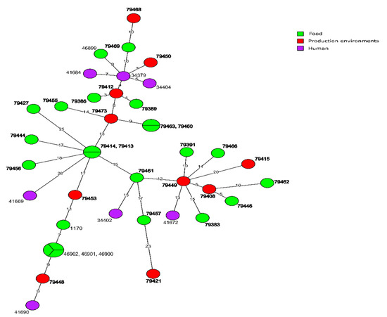 Minimum spanning tree (MST) based on the cgMLST profiles of L. monocytogenes CC121 tested in the present study with publicly available 20 strains of CC121 from Poland. Source of the isolates are represented by colored circles where the size is proportional to the number of strains. Numbers on the branches show alleles differences between neighboring nodes (CTs). The strain numbers in bold represent L. monocytogenes isolates from the present study.