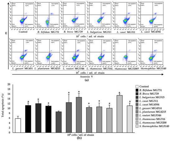 - Altonsy, M.O.; Andrews, S.C.; Tuohy, K.M. Differential induction of apoptosis in human colonic carcinoma cells (Caco-2) by Atopobium, and commensal, probiotic and enteropathogenic bacteria: Mediation by the mitochondrial pathway. Int. J. Food Microbiol. 2010, 137, 190–203. [Google Scholar] [CrossRef] [PubMed]