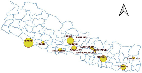 Map showing the geographical locations and sample size of the LSD-affected districts in Nepal between August and October 2020.