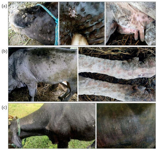 Lesions in LSD suspected animals. (a) Local Terai cow with nodular skin lesions over the face, neck, and udder. (b) Local cow with nodular skin lesions all over the body and limbs. (c) Buffalo showing small skin nodules all over the body.